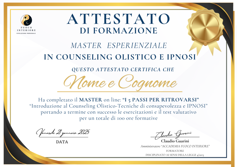 Il MASTER – I 5 Passi per Ritrovarti è stato creato proprio per questo: un cammino esperienziale che unisce introspezione e pratica concreta, con strumenti di counseling e ipnosi trasformativa. Non semplici incontri teorici, ma un’esperienza capace di cambiare la percezione che hai di te stesso e offrirti nuove risorse da integrare nella tua vita e nella tua professione.