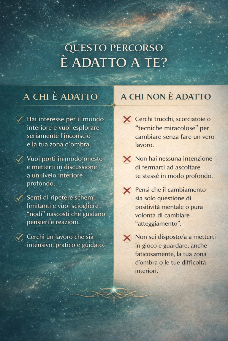 È un lavoro intensivo e mirato, strutturato in 8 incontri online + 1 incontro bonus, pensato per chi sente di essere fermo o intrappolato in meccanismi che si ripetono e non ha bisogno di capire di più, ma di lavorare in modo concreto su ciò che si muove dentro.